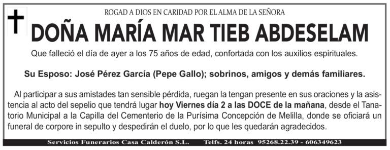 Al participar a sus amistades tan sensible pérdida, ruegan la tengan presente en sus oraciones y la asistencia al acto del sepelio que tendrá lugar hoy Viernes día 2 a las DOCE de la mañana, desde el Tanatorio Municipal a la Capilla del Cementerio de la Purísima Concepción de Melilla, donde se oficiará un funeral de corpore in sepulto y despedirán el duelo, por lo que les quedarán agradecidos.