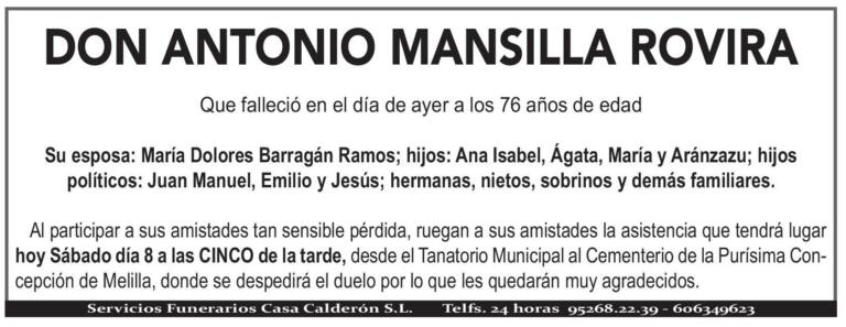 Al participar a sus amistades tan sensible pérdida, ruegan a sus amistades la asistencia que tendrá lugar hoy Sábado día 8 a las CINCO de la tarde, desde el Tanatorio Municipal al Cementerio de la Purísima Concepción de Melilla, donde se despedirá el duelo por lo que les quedarán muy agradecidos. DON ANTONIO MANSILLA ROVIRA