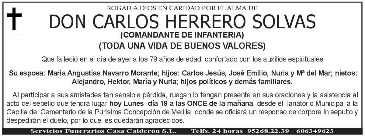 Al participar a sus amistades tan sensible pérdida, ruegan lo tengan presente en sus oraciones y la asistencia al acto del sepelio que tendrá lugar hoy Lunes día 19 a las ONCE de la mañana, desde el Tanatorio Municipal a la Capilla del Cementerio de la Purísima Concepción de Melilla, donde se oficiará un responso de corpore in sepulto y despedirán el duelo, por lo que les quedarán agradecidos.