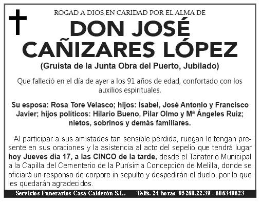 Don José CAÑIZARES López (Gruista de la Junta Obra del Puerto, Jubilado) Que falleció en el día de ayer a los 91 años de edad, confortado con los auxilios espirituales.