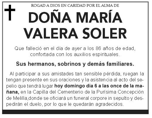 ROGAD A DIOS EN CARIDAD POR EL ALMA DE Esquela de Doña María Valera Soler Que falleció en el día de ayer a los 86 años de edad, confortada con los auxilios espirituales.