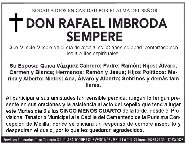 Al participar a sus amistades tan sensible pérdida, ruegan la tengan presente en sus oraciones y la asistencia al acto del sepelio que tendrá lugar el Sábado día 7 a las CUATRO MENOS CUARTO de la tarde (15.45 horas), desde el provisional Tanatorio Municipal a la Capilla del Cementerio de la Purísima Concepción de Melilla, donde se oficiará un responso de corpore-insepulto y despedirán el duelo, por lo que les quedarán agradecidos.