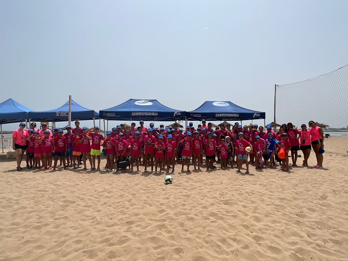 La segunda parte sirvió para dotar a los alumnos y las alumnas del material, en concreto camisetas, gorra y mochilas, mientras que en la tercera fase tuvieron su primera toma de contacto con el deporte de playa por excelencia, comenzando por los gestos y técnicas más básicos, un tramo de juego libre y una exhibición de los monitores Sufian y Rafi.