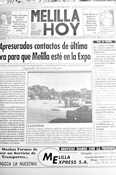 El hecho de que las diecisiete comunidades autónoma estuvieran presentes en la celebración de la Expo de Sevilla, motivaba que Melilla y Ceuta también quisieran estar presentes en este encuentro mundial. Gracias a la labor de la presidenta de la Confederación de Empresarios de Melilla, Margarita López Almendáriz, se encendía la luz de esperanza de estar presentes en la expo. López Almendáriz y el alcalde Ignacio Velázquez viajaban a Sevilla para entrevistarse con el responsable del pabellón de España, para lograr que la ciudad pudiera estar presente. Los delegados llevaban incluso un boceto del futuro pabellón de Melilla, desde el que darse a conocer al mundo.