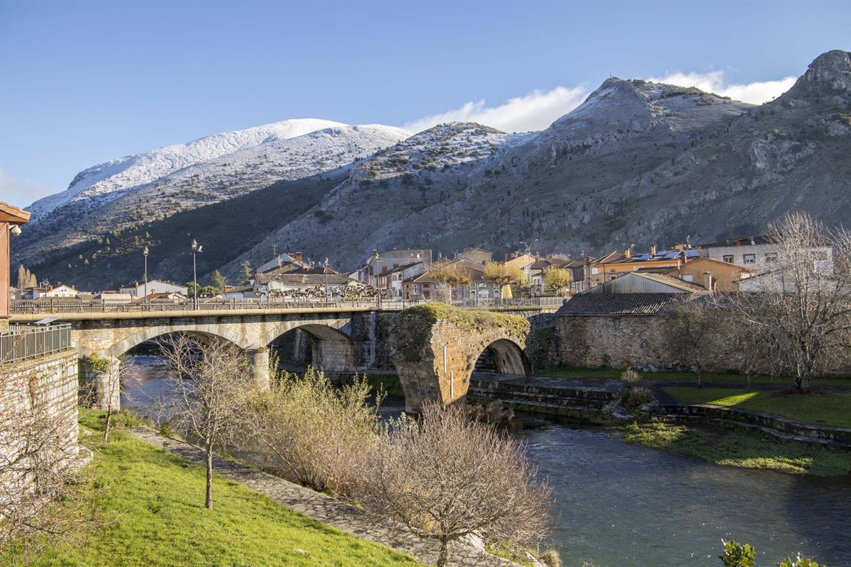 Hermosa vista del puente sobre el río con montañas al fondo.