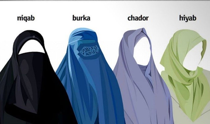 Ilustración que muestra las diferencias entre burka, niqab, chador y hiyab.