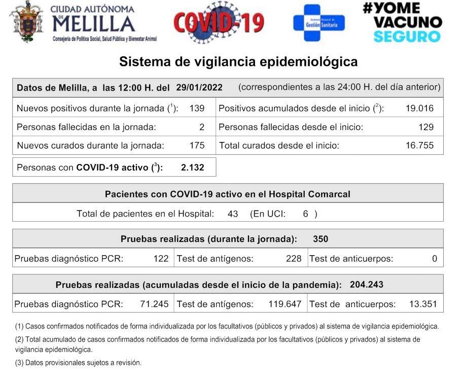 Por otro lado, Melilla cuenta con 2.132 personas con covid-19 activo en tras registrar 139 contagios en las últimas 24 horas, lo que eleva el total a 19.016 desde el inicio de la pandemia en la ciudad, mientras que hubo 175 curaciones en las últimas 24 horas, siendo 16.755 el número total de ciudadanos que han superado la enfermedad.