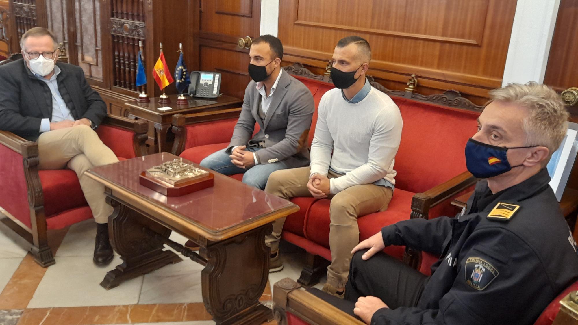 El presidente de la Ciudad, Eduardo de Castro, junto con dos de los agentes de la Policía Local que salvaron la vida al bebé