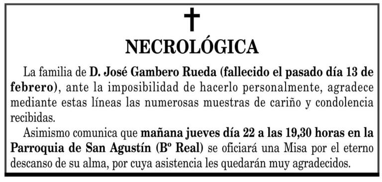 La familia de D. José Gambero Rueda (fallecido el pasado día 13 de febrero), ante la imposibilidad de hacerlo personalmente, agradece mediante estas líneas las numerosas muestras de cariño y condolencia recibidas