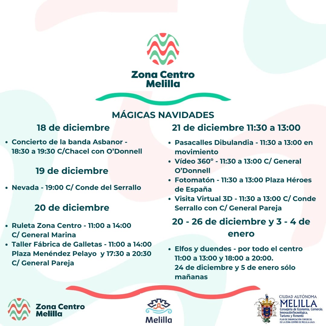 Las actividades no se limitan solo al fin de semana. Desde el 20 hasta el 26 de diciembre, y el 3 y 4 de enero, los elfos y duendes del Plan Estratégico de Dinamización de Comercio y el Centro Histórico de Melilla recorrerán el centro de la ciudad en horarios de 11:00 a 13:00 y de 18:00 a 20:00 horas. Los días 24 de diciembre y 5 de enero, estos personajes realizarán pases especiales solo por la mañana.