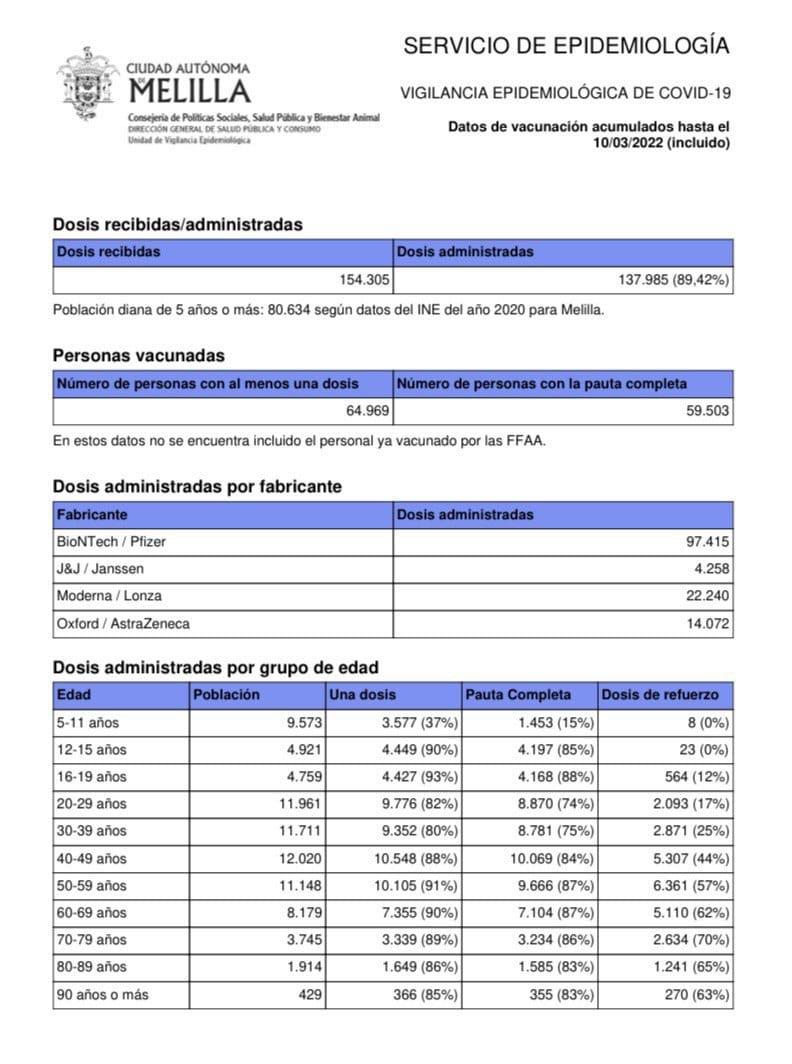 En términos generales, el número de melillenses con al menos una dosis de la vacuna es de 64.969 (75’54%), mientras que 59.503 cuenta con la pauta completa (69’18%), aunque en estas cifras no se incluyen las personas vacunadas por las Fuerzas Armadas. El número total de dosis que se han administrado alcanza las 137.985 (89’42%), de las 154.305 que se han recibido, de las cuales se han suministrado mayormente Pfizer con 97.415 dosis.