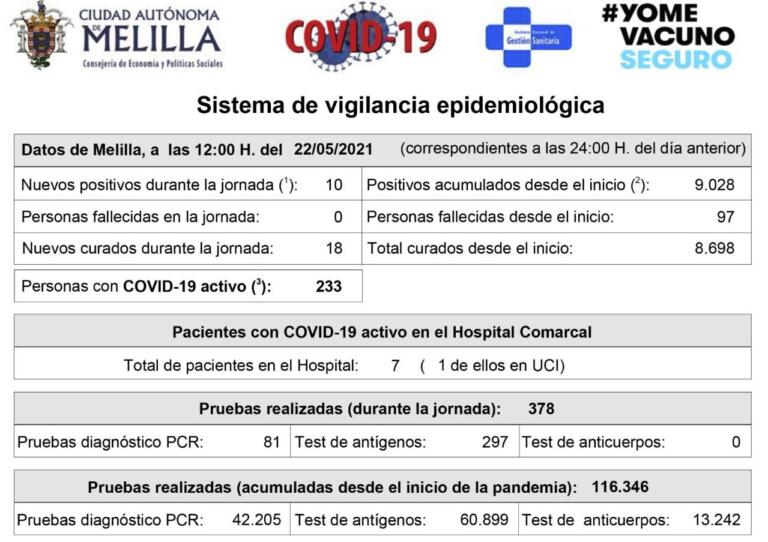El número de casos positivos de covid–19 en Melilla sigue bajando un día más después de que los datos proporcionados el sábado por las autoridades sanitarias reflejen que hubo 18 curados por 10 nuevos contagios, lo que permite reducir la cifra total en 8, hasta situarse el total de positivos en 233. Además de bajar los contagios, también ha descendido el número de hospitalizados al pasar de 9 a 7, aunque se mantiene un paciente en la Unidad de Cuidados Intensivos (UCI) del Hospital Comarcal de Melilla.