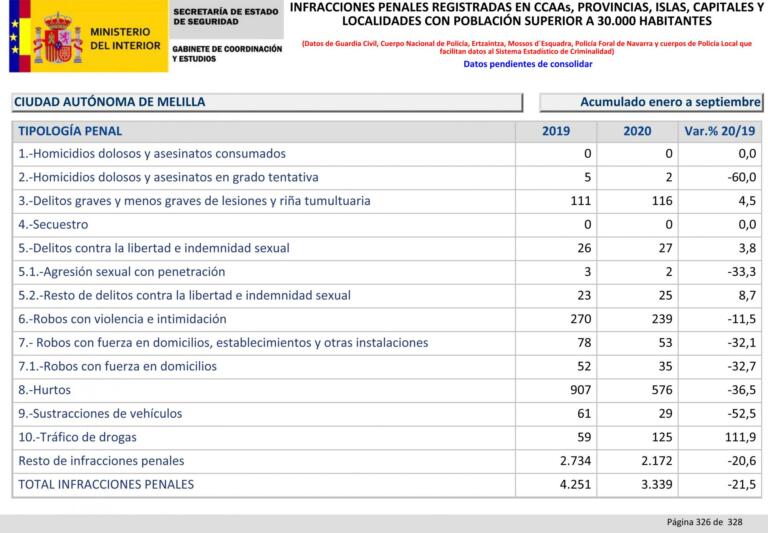 A nivel nacional, al igual que en Melilla, la criminalidad sigue bajando por la pandemia y las restricciones a la movilidad. En los nueve primeros meses del año las infracciones penales (delitos y faltas) han caído un 20,2%.