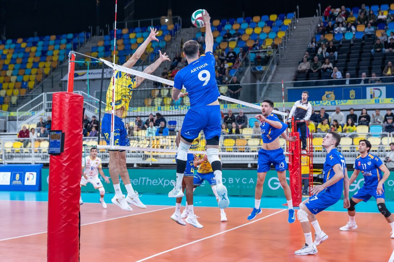 El conjunto de Salim Abdelkader comenzó el encuentro con seriedad y buena actitud competitiva, manteniendo la igualdad en los primeros compases del primer set, con intercambios de puntos hasta el 4-4. Sin embargo, la presión ejercida por el equipo grancanario desde el saque y su solidez en todas las facetas del juego empezaron a marcar diferencias a partir del 6-4. A pesar de los tiempos muertos solicitados por Salim Abdelkader y los intentos por frenar la dinámica local, el equipo canario fue ampliando su ventaja progresivamente hasta cerrar el parcial por 25-15.