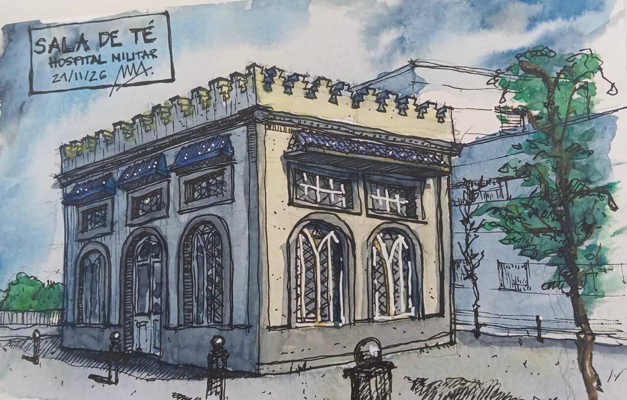 El salón de té del Hospital Militar fue construido en octubre de 1938 como hogar del oficial y en honor a los heridos en la guerra. Así pues, 88 años después de su construcción, los Urban Sketchers han escogido este lugar como motivo de sus dibujos, plasmando en sus cuadernos este singular rincón histórico de la ciudad. El Hospital Militar de Melilla fue construido en 1910, utilizándose barracones desmontables de madera tipo «Docker». Por ello durante muchos años fue conocido popularmente como «Hospital Docker».