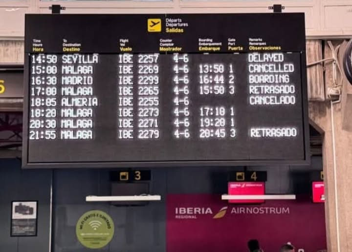 La pantalla muestra vuelos retrasados y cancelados en el aeropuerto de Melilla.