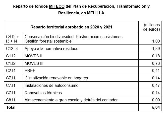 El Ministerio para la Transición Ecológica y el Reto Demográfico (MITECO) ha transferido a Melilla 5,04 millones de euros, enmarcados en el Plan de Recuperación, Transformación y Resiliencia, según ha informado la Delegación del Gobierno que dirige Sabrina Moh.