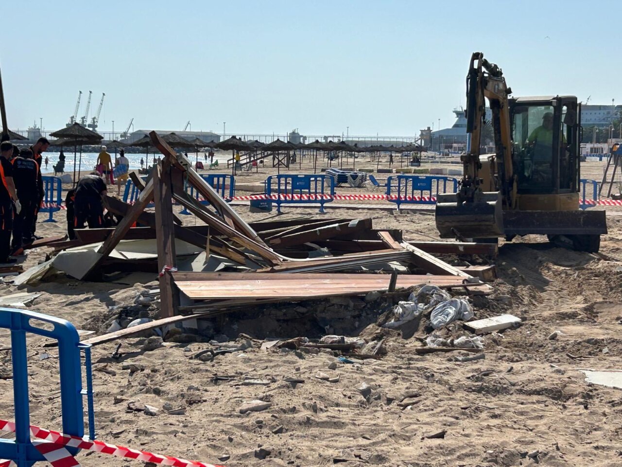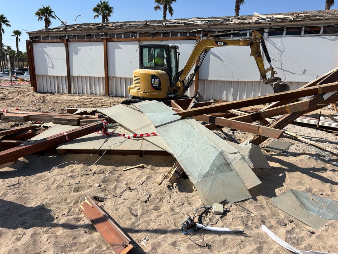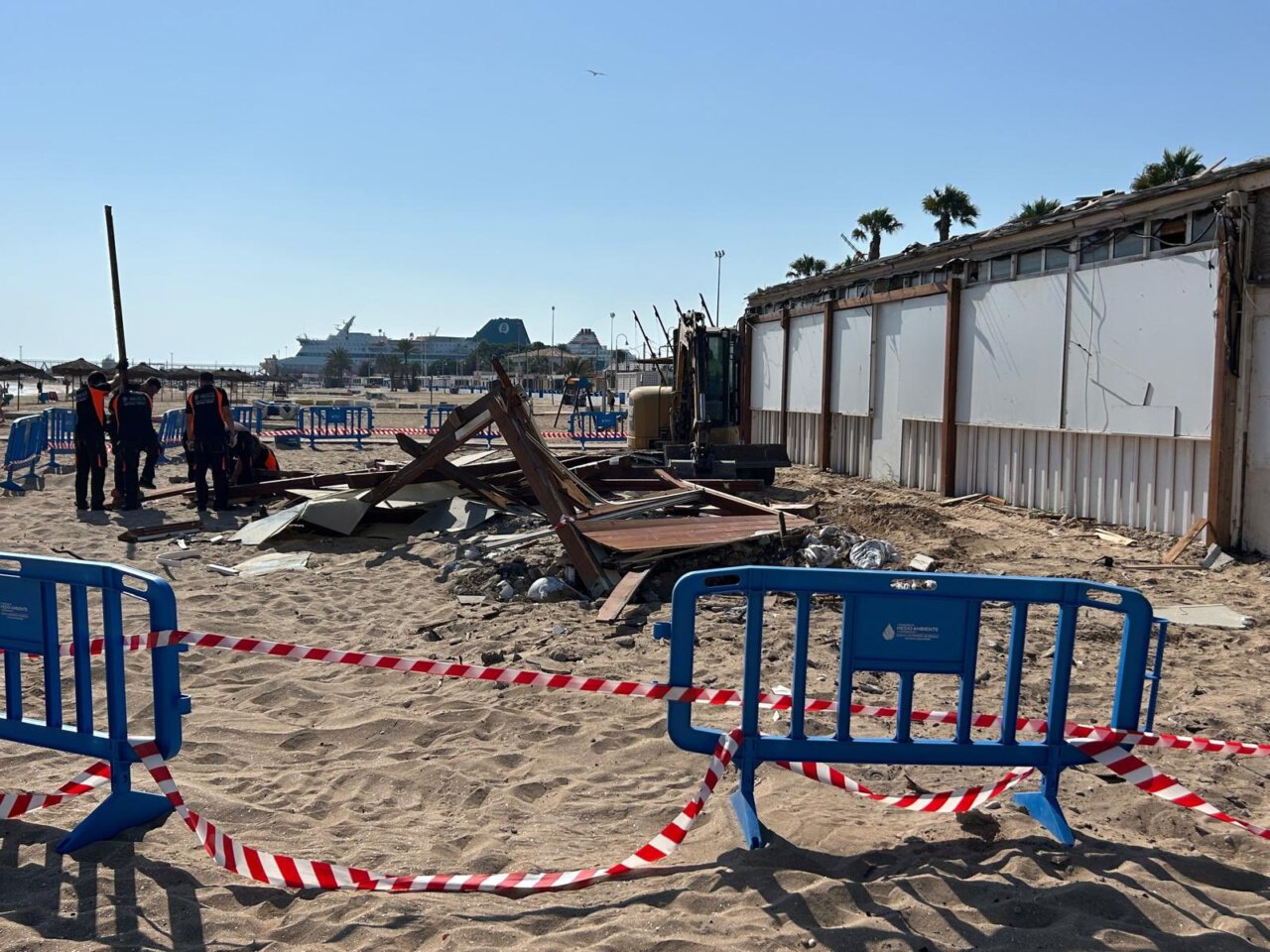 La Consejería de Medio Ambiente ha continuado esta mañana la retirada de algunos elementos del chiringuito ‘Bambú, en la playa de La Hípica, porque presentaban riesgos para la seguridad de los usuarios.