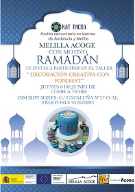 La Asociación de Melilla Acoge organizara para este jueves 8 de junio un taller de "Decoración creativa con fondant", que está diseñado para los amantes de la repostería y curiosos por aprender a trabajar esta técnica. En el taller se trabajará con diseños relacionados con el mes del Ramadán. A los asistentes se les facilitarán las herramientas para que "dejes volar tu imaginación", así que "ven y participa, no olvides inscribirte, las plazas son limitadas. #proyectokaypacha", indican. La Asociación de Melilla Acoge organizara para este jueves 8 de junio un taller de "Decoración creativa con fondant", que está diseñado para los amantes de la repostería y curiosos por aprender a trabajar esta técnica. En el taller se trabajará con diseños relacionados con el mes del Ramadán. A los asistentes se les facilitarán las herramientas para que "dejes volar tu imaginación", así que "ven y participa, no olvides inscribirte, las plazas son limitadas. #proyectokaypacha", indican.