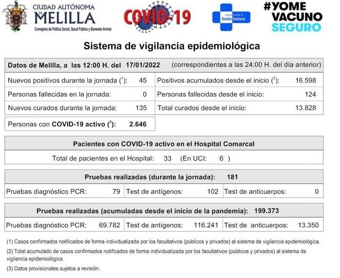Los datos de la Consejería de Política Social, Salud Pública y Bienestar Animal indican que en Melilla han sido confirmados 45 nuevos contagios de coronavirus y 135 personas se han podido recuperar, lo que reduce el número de casos activos por debajo de la barrera de los 2.700.