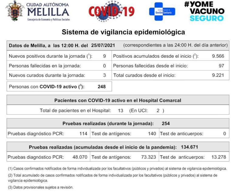 Siguen subiendo los positivos y las hospitalizaciones en Melilla: este domingo aumentan hasta los 248 casos tras 9 nuevos contagios por 3 curados y los ingresados en el Comarcal suben de 11 a 13 en un solo día, aunque en UCI se mantiene la cifra de 2.