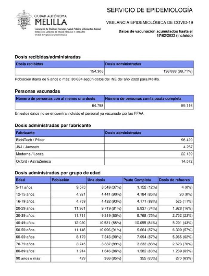 Melilla ha recibido 154.305 vacunas desde que comenzó la campaña de vacunación el 27 de diciembre de 2020, de las que se han suministrado hasta ahora 136.886, es decir el 88,71%, entre la población diana de 5 años o más, 80.634 habitantes según datos del INE. Según las cifras facilitados por las autoridades sanitarias, al menos 64.798 personas tienen al menos dosis y 59.116 la pauta completa.