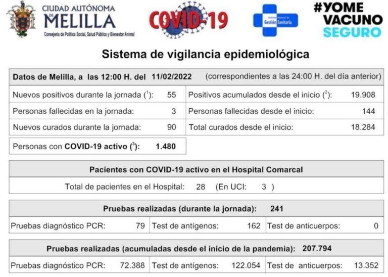 Según la última actualización de la evolución de la pandemia facilitada por la Consejería de Política Social, Salud Pública y Bienestar Animal y el Instituto Nacional de Gestión Sanitaria (Ingesa), los casos activos de coronavirus han descendido en Melilla, situándose en 1.480, después de ser notificados 55 nuevos contagios y 90 curados, además de los 3 fallecidos.