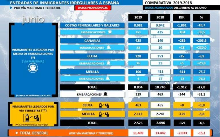 Según los datos del Ministerio del Interior, la llegada de migrantes por vía marítima ha crecido un 172,7%, con 4.889 inmigrantes que han llegado en 126 pateras. El año pasado fueron 1.793 y 78 pateras a estas alturas de 2018. La diferencia es de 3.096 y 48 embarcaciones más.