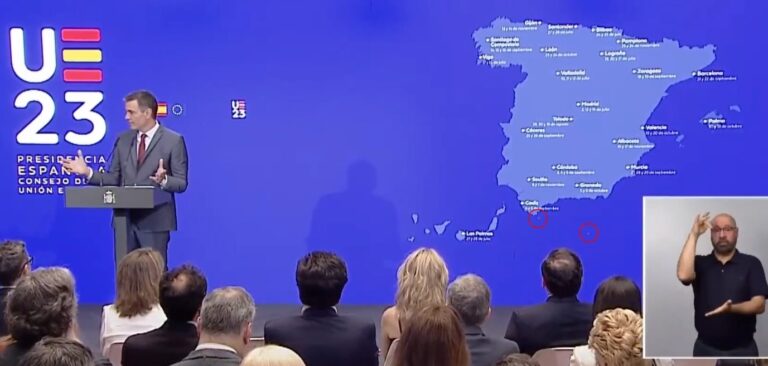 Melilla y Ceuta serán las únicas regiones españolas que no albergarán ninguna de las cumbres ministeriales y actividades culturales programadas por el Gobierno de España durante la Presidencia rotatoria del Consejo de la Unión Europea, que nuestro país ostentará desde el próximo 1 de julio. El presidente del Gobierno, Pedro Sánchez, ha presentado este jueves esta programación, que ha causado polémica en las redes sociales después de que algunos usuarios y partidos políticos se quejaran de que en el mapa proyectado por Moncloa no aparecían representadas ni Melilla ni Ceuta. Este “bulo” ha sido desmentido por la Delegación del Gobierno, que ha difundido imágenes del mapa empleado en la comparecencia de Sánchez con las dos ciudades rodeadas por sendos círculos rojos.