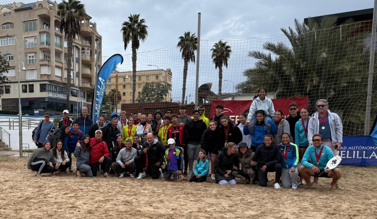 Los ganadores del II Máster Nacional MAPFRE de Tenis Playa en Melilla se reúnen para una foto grupal.