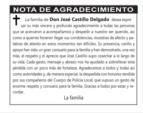 La familia de Don José Castillo Delgado expresa su agradecimiento a quienes les apoyaron.