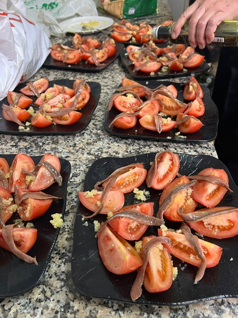 El menú estaba compuesto por un plato de tomates selectos al ajillo con anchoas del Cantábrico y aceite con albahaca como plato entrante, cardo navarro con tropezones ibéricos como primer plato, pollo en salsa de almendras con papas horneadas, y como postre brazo gitano de chocolate.