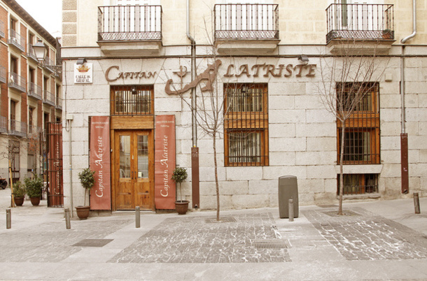 El itinerario comienza en la plaza Mayor, el corazón de Madrid y del mundo en el tiempo en que se desarrollan las aventuras del capitán, donde se recrean sus paseos por los soportales entre los puestos de pan y verduras en compañía del alguacil Saldaña, según recogen los textos extraídos del libro Viaje a los escenarios del capitán Alatristre, de Juan Eslava Galán.