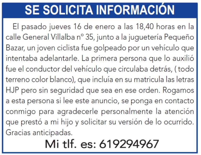Mi tlf. es: 619294967 El pasado jueves 16 de enero a las 18,40 horas en la calle General Villalba nº 35, junto a la juguetería Pequeño Bazar, un joven ciclista fue golpeado por un vehículo que intentaba adelantarle. La primera persona que lo auxilió fue el conductor del vehículo que circulaba detrás, ( todo terreno color blanco), que incluía en su matricula las letras HJP pero sin seguridad que sea en ese orden. Rogamos a esta persona si lee este anuncio, se ponga en contacto conmigo para agradecerle personalmente la atención que prestó a mi hijo y solicitar su versión de lo ocurrido. Gracias anticipadas.