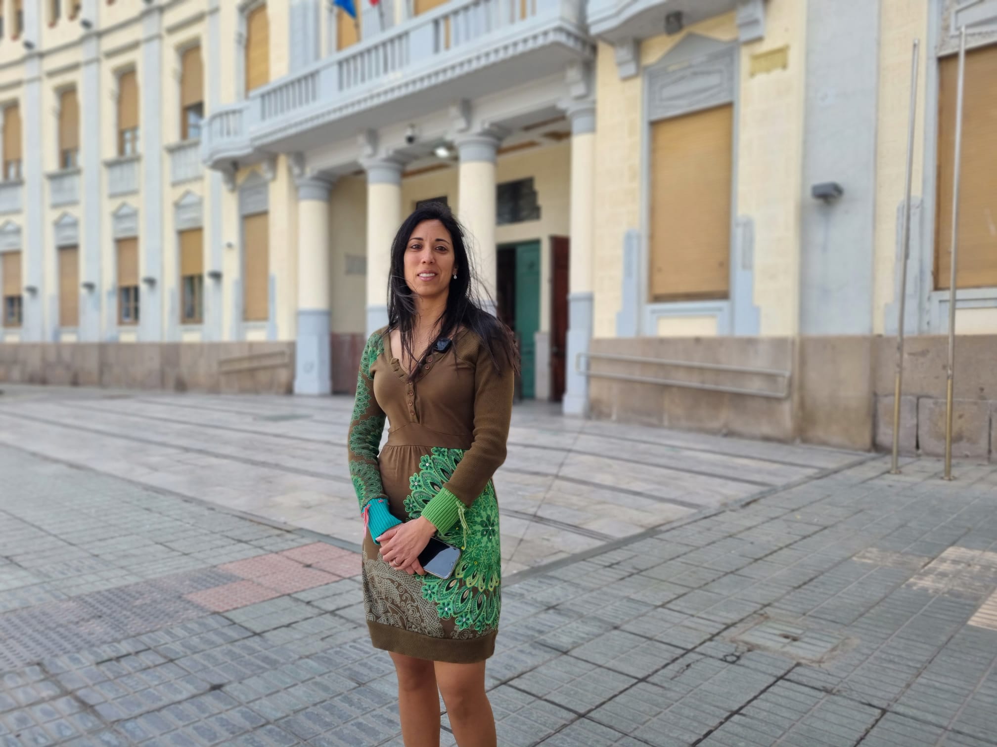 Una mujer posa frente a un edificio emblemático en Melilla.