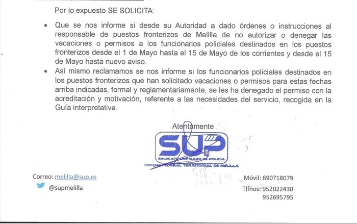 El Sindicato Unificado de Policía (SUP) ha registrado un escrito en la Jefatura Superior de Policía para que aclare si ha dado órdenes o instrucciones al responsable de puestos fronterizos de Melilla de no autorizar o denegar las vacaciones o permisos a los funcionarios policiales destinados en dichos puestos entre el 1 y el 15 de mayo y a partir del día 15 “hasta nuevo aviso”. El sindicato muestra dudas sobre la “recomendación de anulación de permisos a agentes de la Policía Nacional destinados en la frontera de Beni-Enzar.