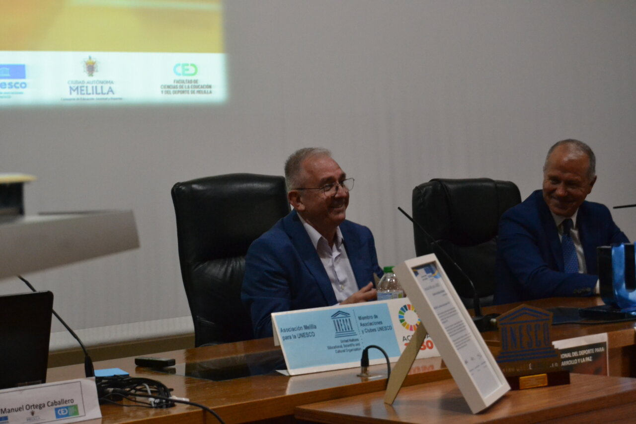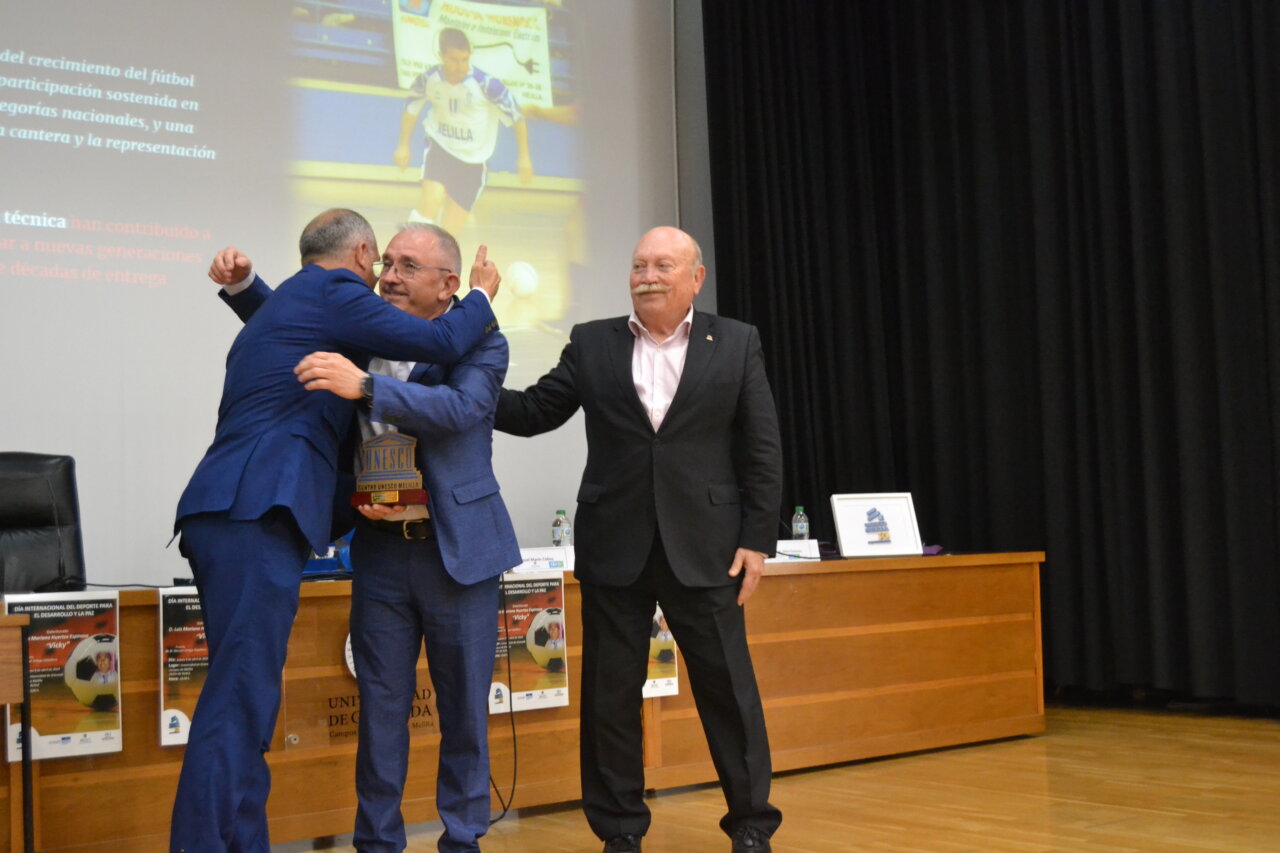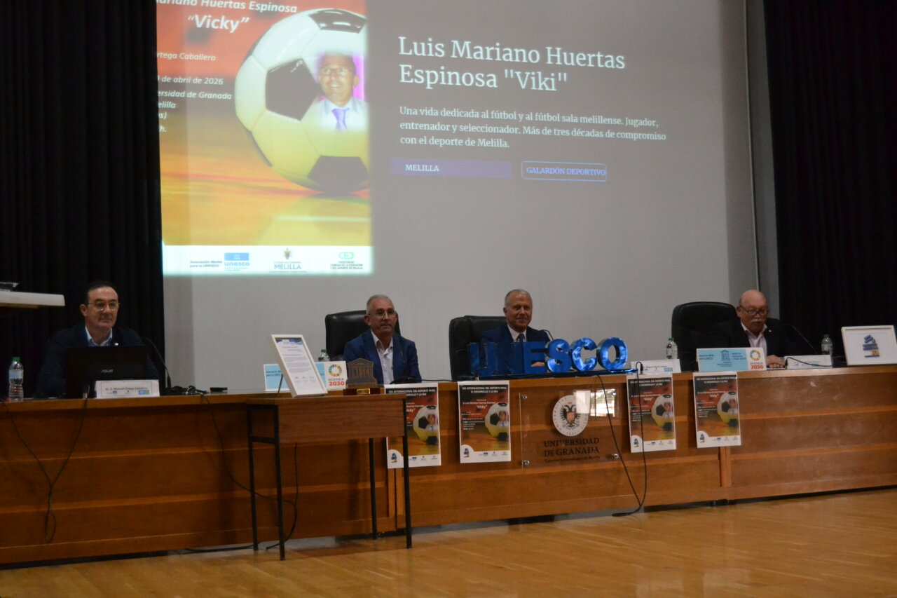 El Salón de Actos del Campus Universitario de Melilla acogió este jueves el acto de entrega del Galardón 2026 a los Valores en el Deporte, organizado por UNESCO-Melilla, en el que Luis Mariano Huertas Espinosa, conocido deportivamente como Vicky, fue distinguido con este reconocimiento en un evento que registró una gran asistencia de público, con la presencia de representantes institucionales, estudiantes, amigos, familiares y personas vinculadas al deporte melillense. El homenajeado estuvo acompañado por el presidente de UNESCO-Melilla, Juan Antonio Vera, el vicepresidente primero de la Ciudad Autónoma, Miguel Marín, y el vicepresidente de la entidad organizadora, Manolo Ortega, quienes arroparon a Vicky en un acto cargado de emoción y reconocimiento a su trayectoria.