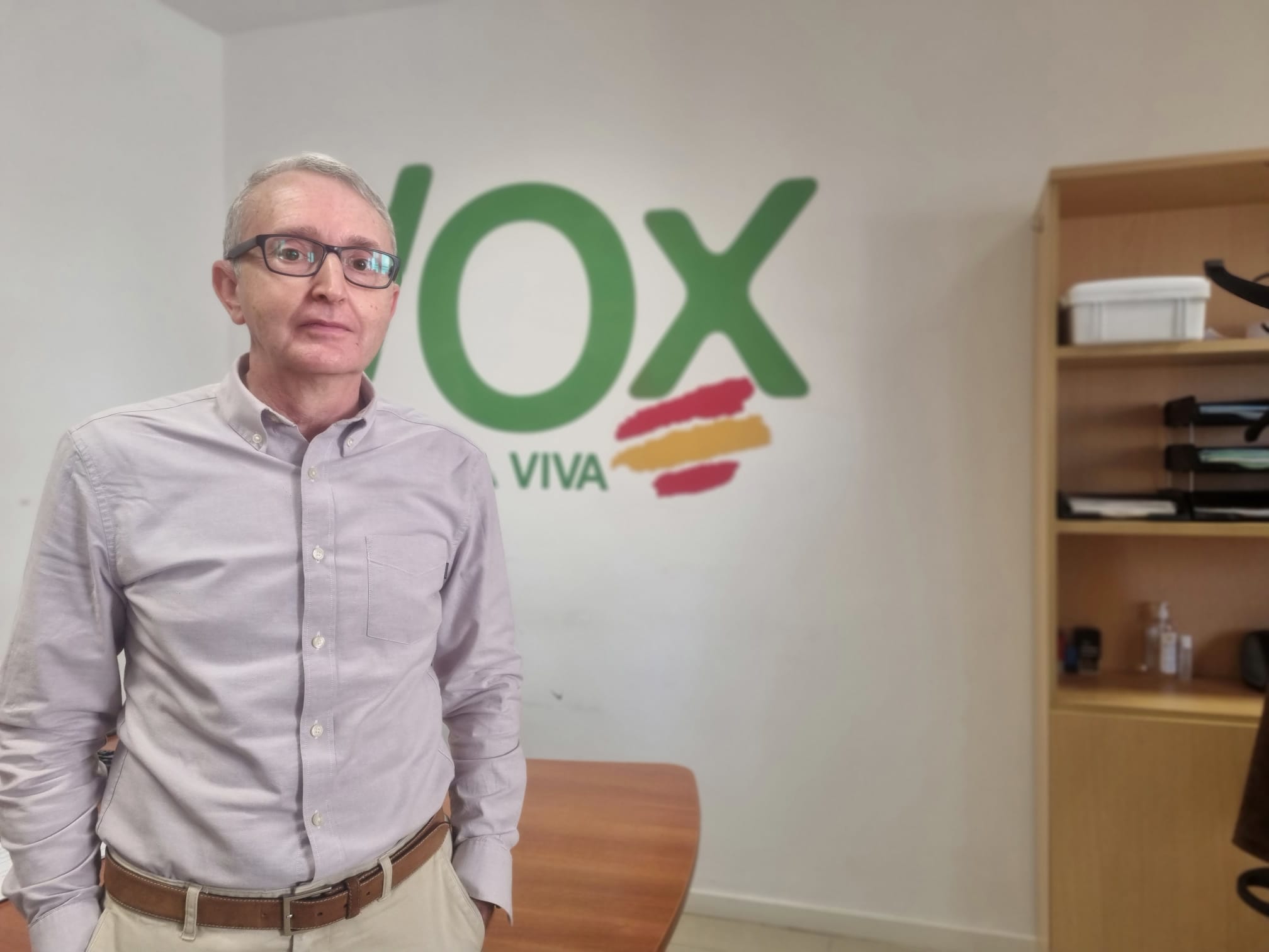 Un hombre en la oficina de VOX, mostrando el logo del partido político.